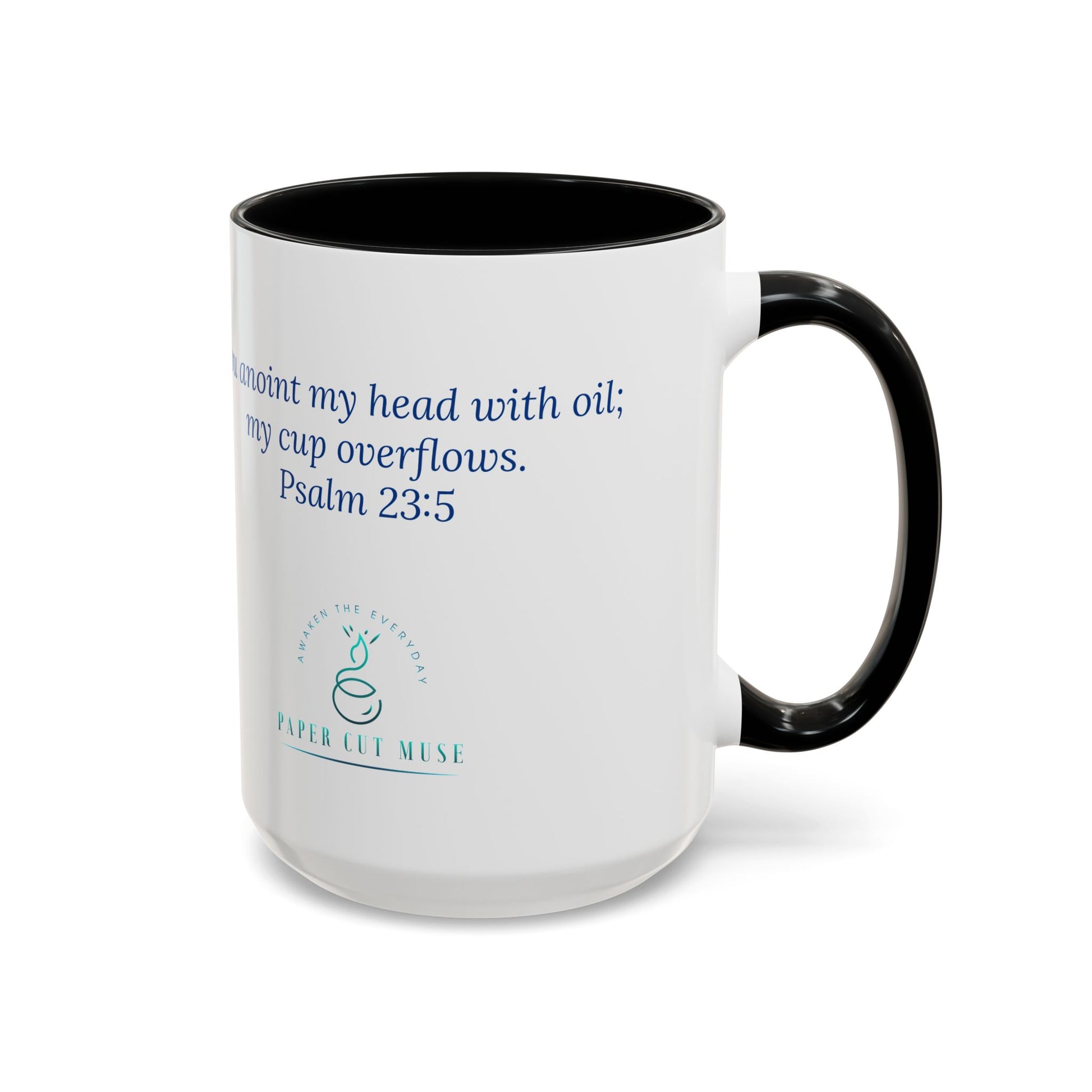 On the reverse, a verse from Psalm 23:5 offers quiet strength: “You anoint my head with oil; my cup overflows.” Beneath the scripture, the Paper Cut Muse logo and affirmation—Awaken the Everyday—invite you to embrace joy not just as a feeling, but as a spiritual posture.