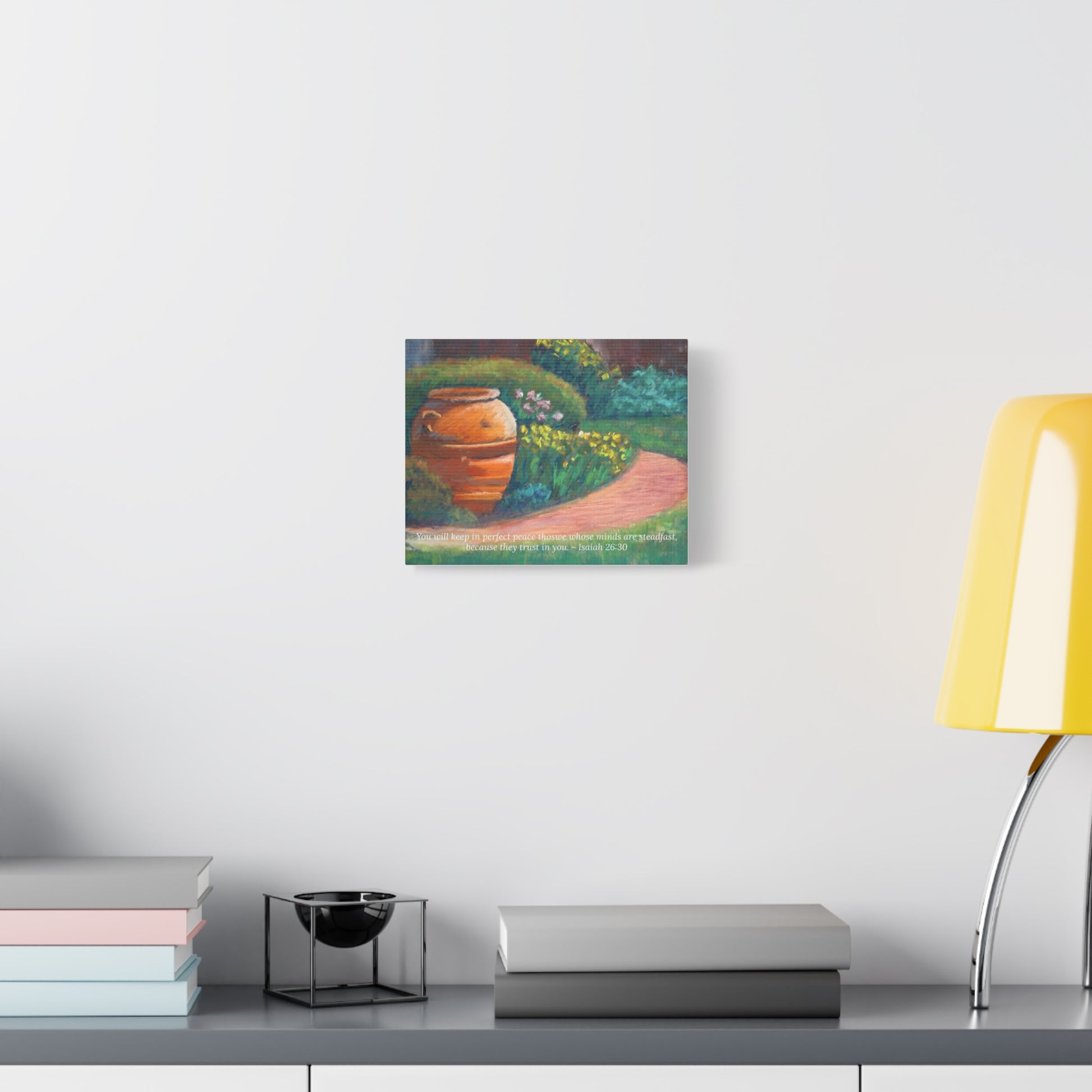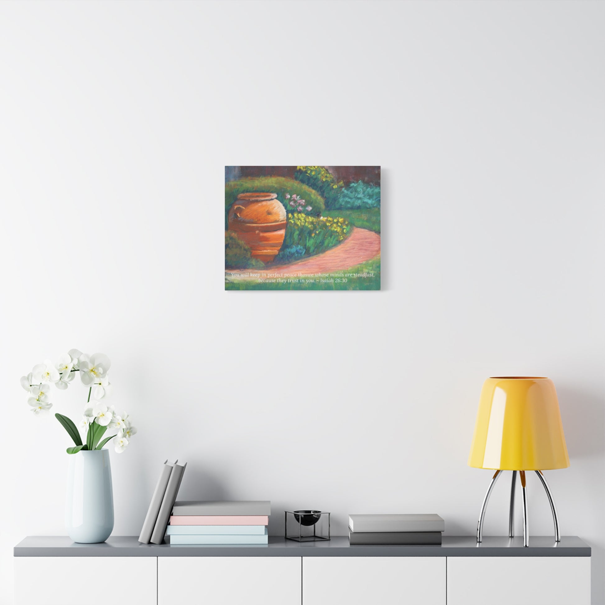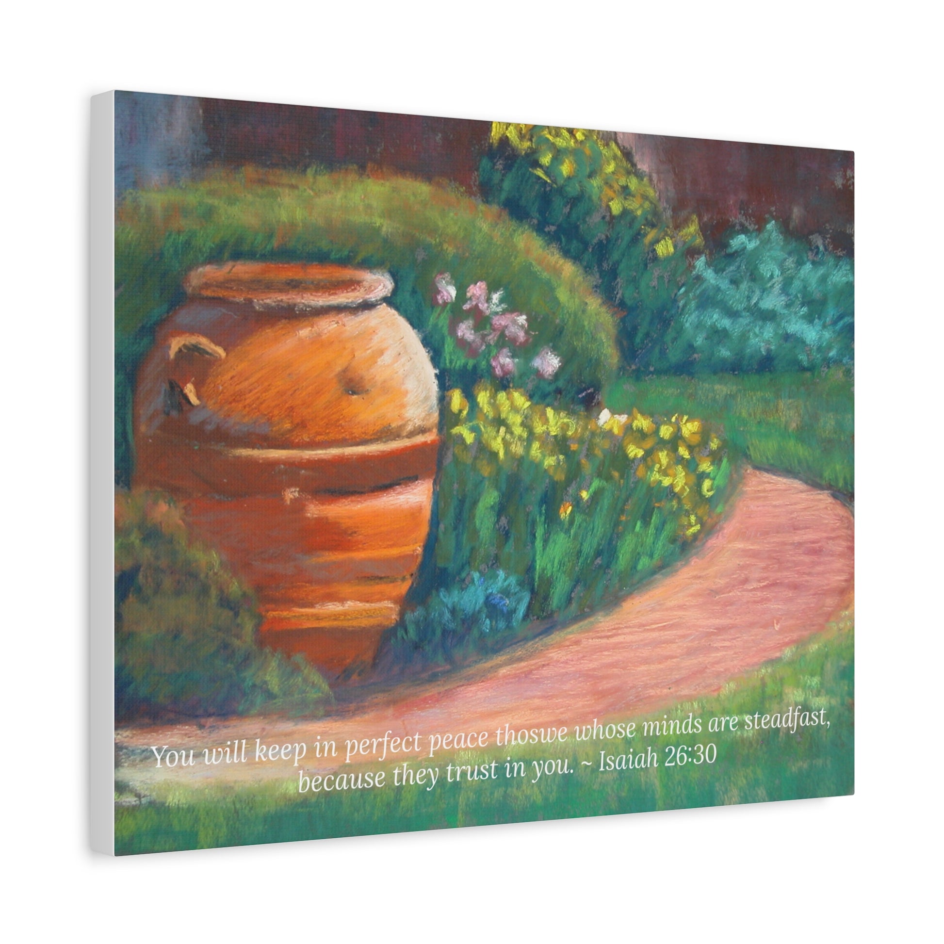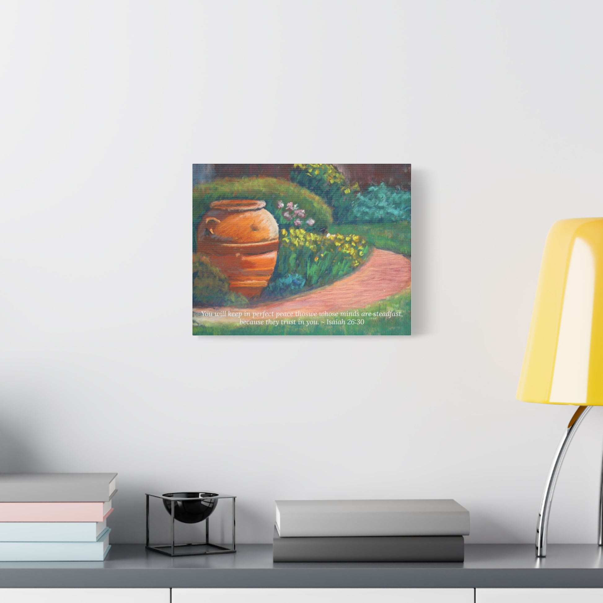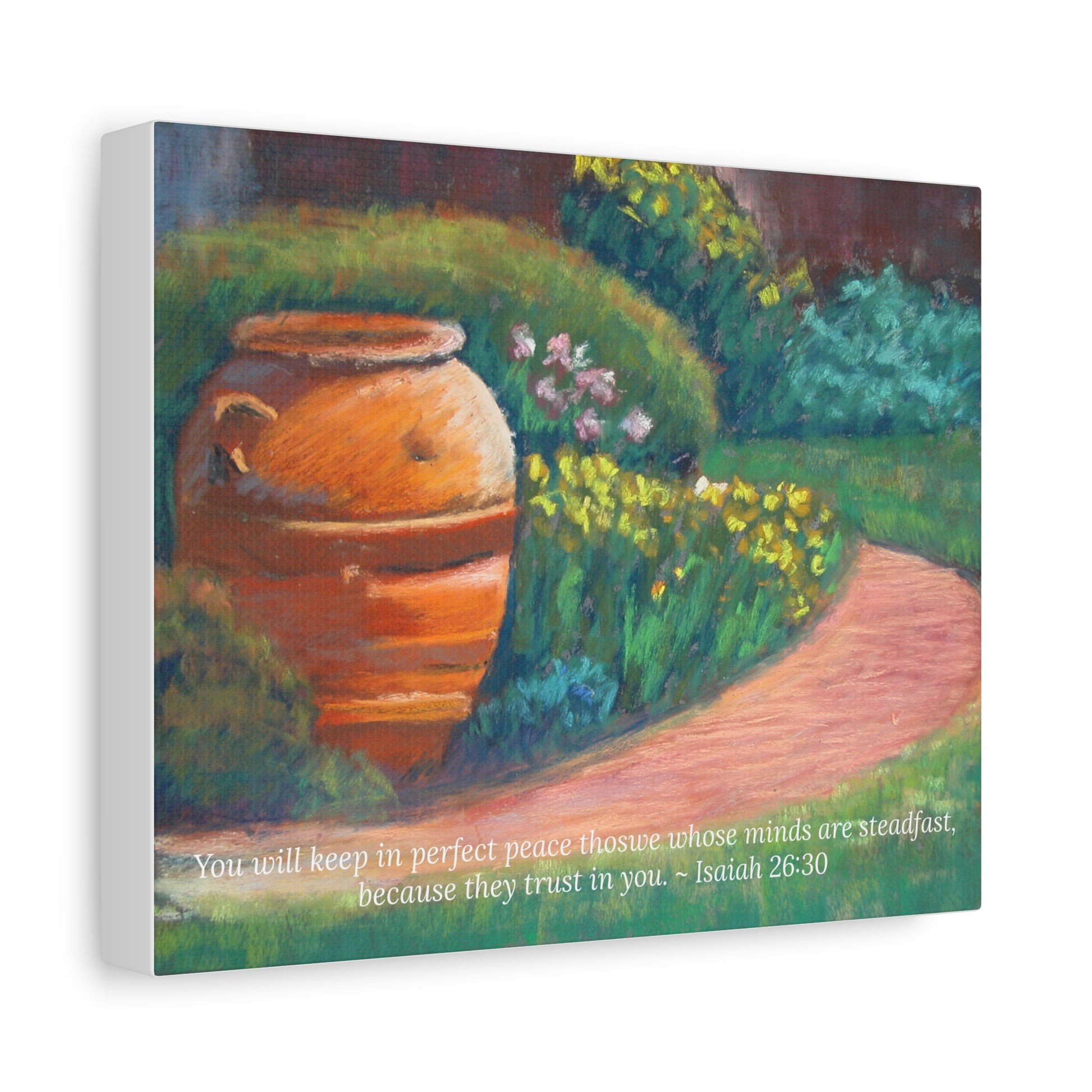 A quiet invitation to rest and reflection, Perfect Peace features original artwork by P. French Barber—a garden still life rendered in warm, grounded tones. A weathered clay pot anchors the composition, surrounded by soft blooms and a winding path that suggests movement toward stillness.