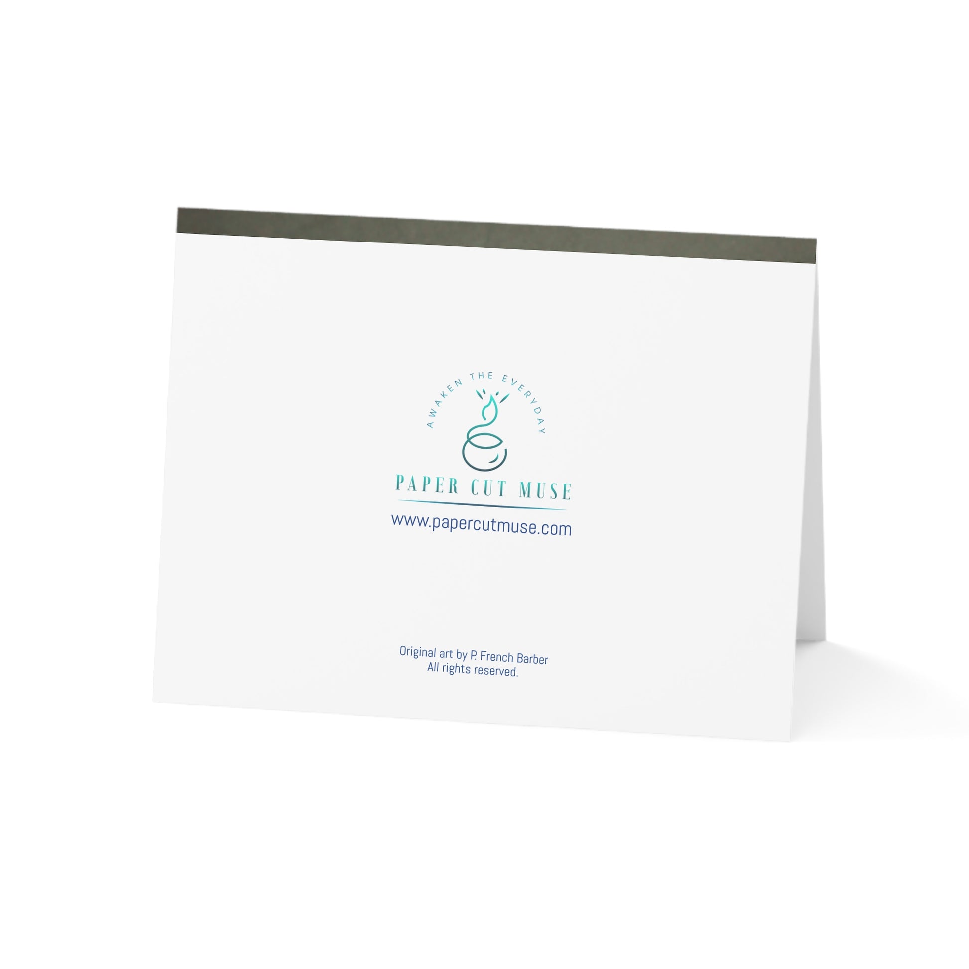 The Stirred with Love card from Paper Cut Muse features an original illustration by P. French Barber—a charming kitchen scene with baking essentials: a mixing bowl, wooden spoon, eggs, flour, butter, and an open recipe book, all set atop a cheerful checkered tablecloth. It’s a visual celebration of creativity, nourishment, and the sacred rhythm of everyday life.