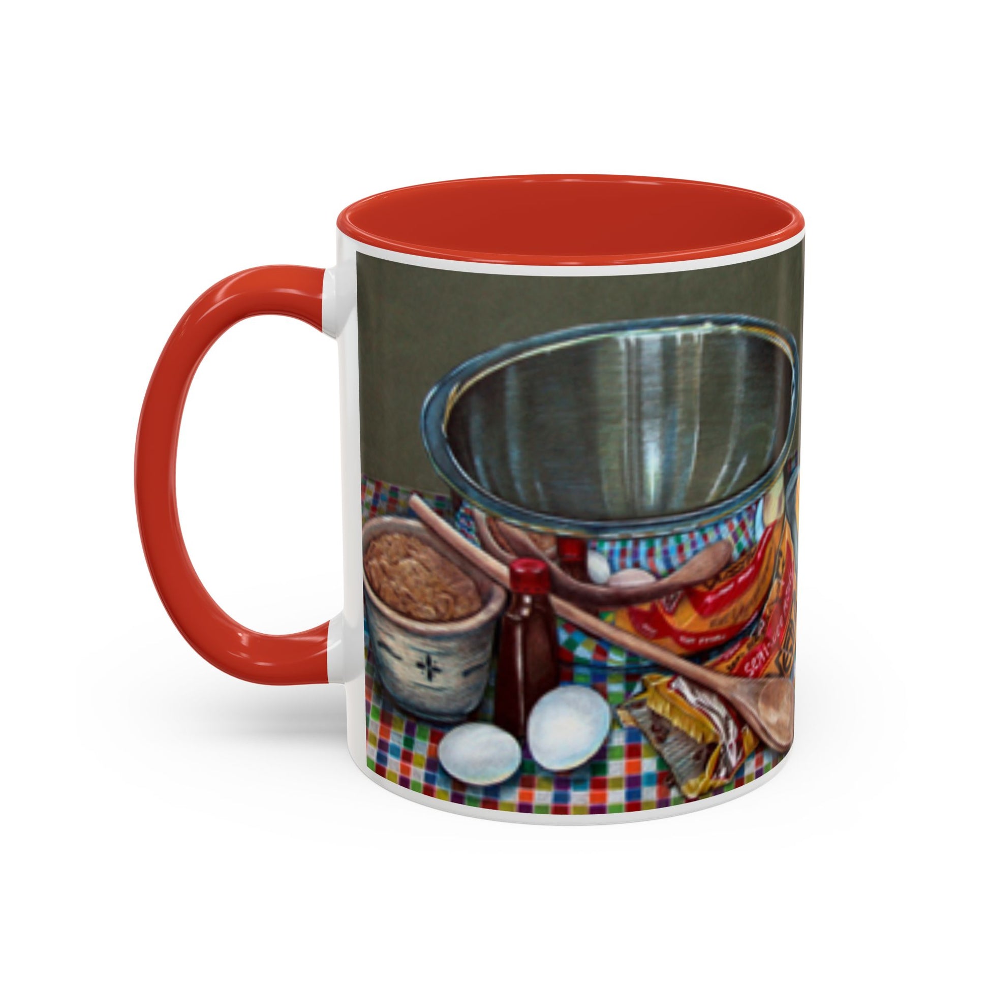 Home is where the heart stirs—and this mug brings that sentiment to life. Featuring an original colored pencil illustration by P. French Barber, Stirred with Love captures a tender kitchen moment: a mixing bowl, measuring cups, eggs, flour, sugar, and chocolate chips all nestled into a cheerful checkered tablecloth. It's a visual recipe for warmth, memory, and quiet joy.