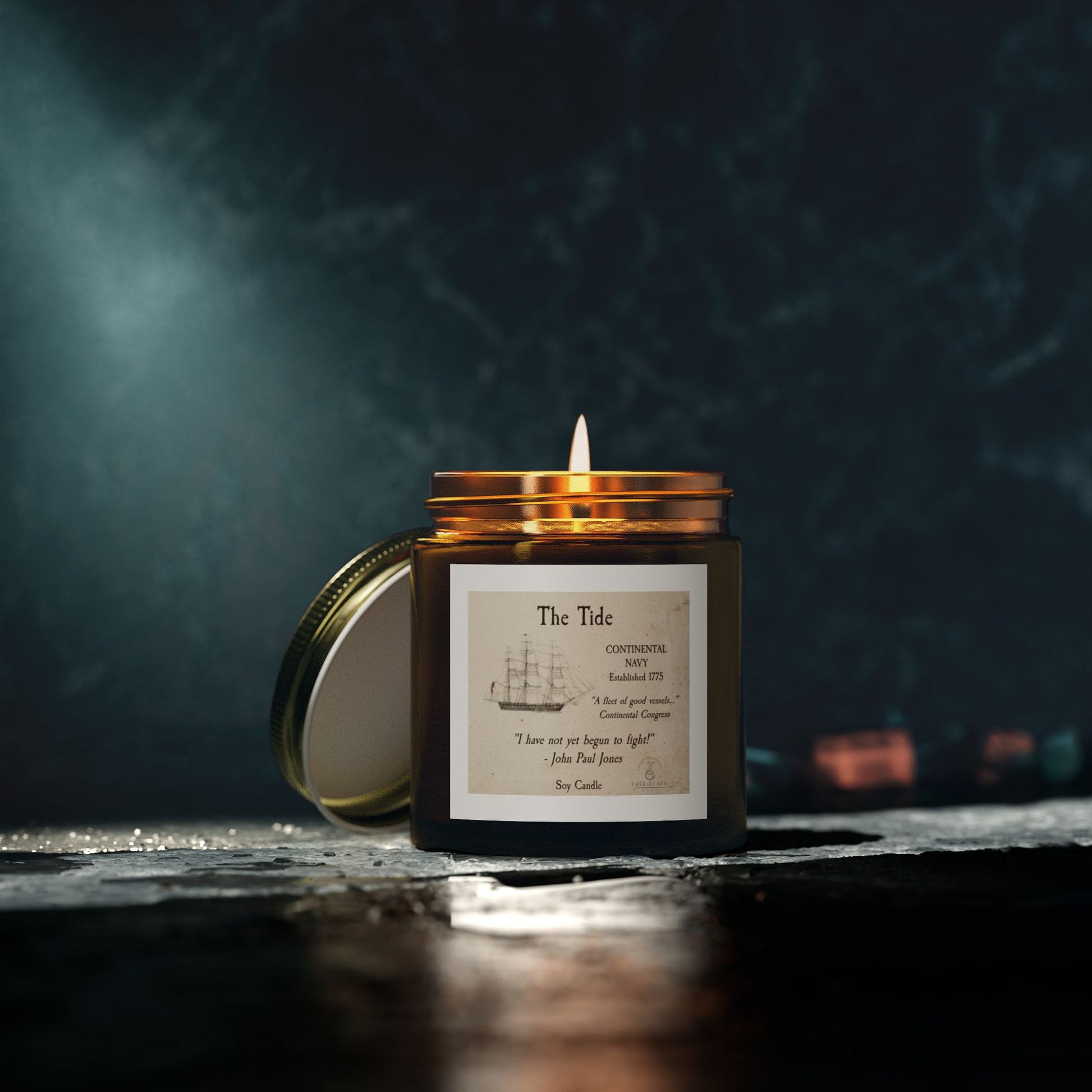 A tribute to the founding spirit of the Continental Navy, The Tide candle evokes the quiet strength of early American resolve. Hand-poured in a brown glass vessel with a gold lid, its restrained design and historical quotes offer a moment of reflection—masculine, grounded, and enduring.